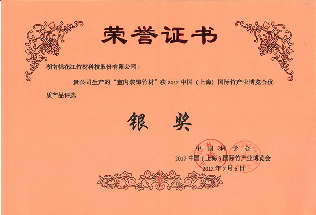 2017年7月,在中國(上海)國際竹產業(yè)博覽會產品評選中湖南桃花江竹材科技的室內裝飾竹材榮獲銀獎。該榮譽是對桃花江竹材科技的高度認可,桃花江生產的室內裝飾竹材取之天然,綠色環(huán)保,古樸自然,是有文化底蘊的室內裝修裝飾材料,是木材的理想替代品。