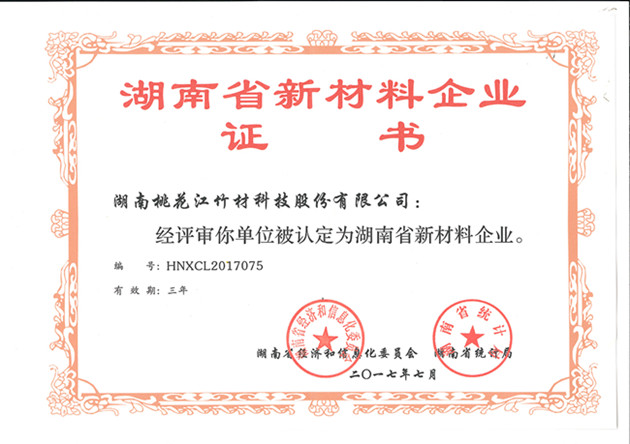 2017年7月,湖南省經(jīng)濟(jì)和信息化委員會(huì)、湖南省統(tǒng)計(jì)局為湖南桃花江竹材科技股份有限公司正式頒發(fā)“湖南省新材料企業(yè)”證書(shū)(證書(shū)編號(hào):HNXCL2017075)。湖南省新材料企業(yè)的認(rèn)定,標(biāo)志著湖南桃花江竹材科技在新型竹材領(lǐng)域的成績(jī)得到國(guó)家認(rèn)可與支持,是一項(xiàng)具有含金量的突破性榮譽(yù)。作為中國(guó)竹業(yè)龍頭企業(yè),湖南桃花江竹材科技一直走在新型竹材研發(fā)、運(yùn)用和推廣的前沿,為全球竹產(chǎn)業(yè)的發(fā)展持續(xù)貢獻(xiàn)力量。