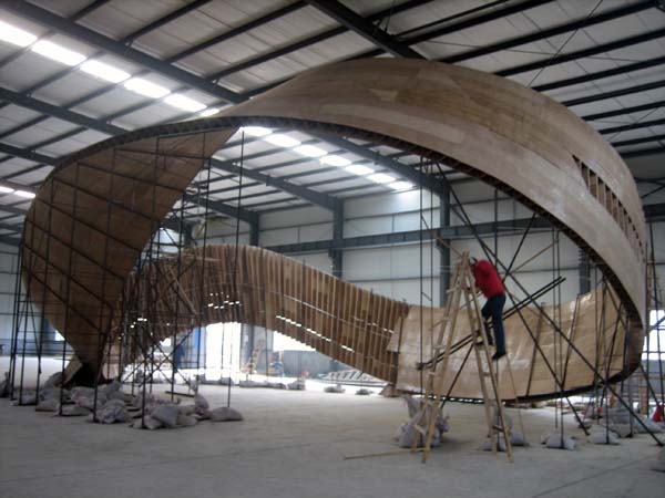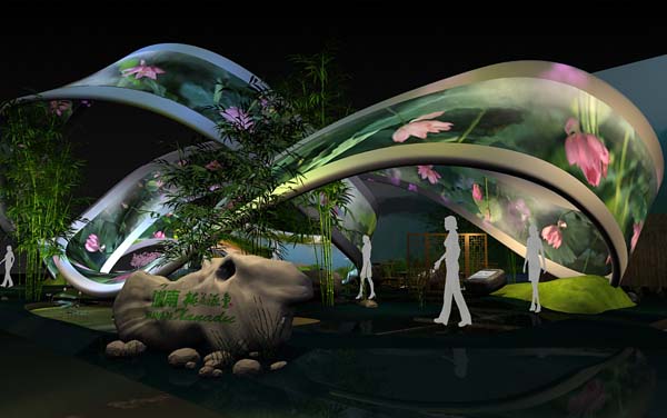 展館的設計形象湖南色彩濃厚,竹、紙、芙蓉花、桃花源、武陵源概念等湖南元素以及蔡倫造紙、隆平水稻、白石藝術等湖湘人文形象貫穿整個設計。環(huán)體主體材料為竹材,由國內(nèi)竹材制造供應基地——湖南桃花江實業(yè)有限公司全程提供